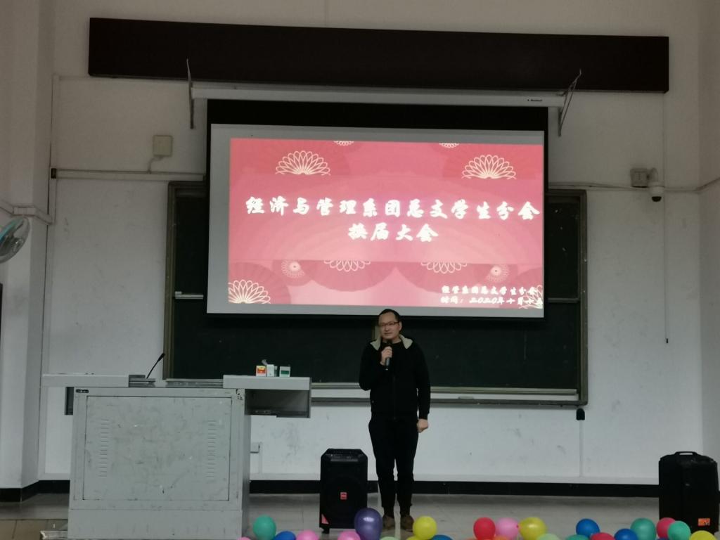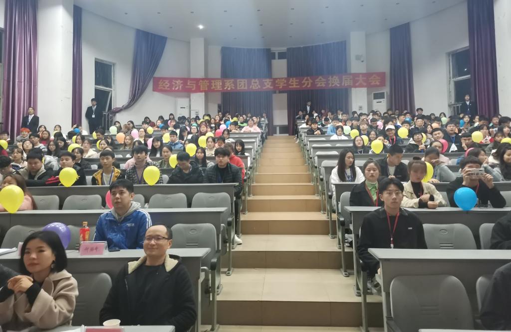 2020年11月4日晚上7点20,经济与管理系团总支学生分会学生干部换届大会在D101顺利召开。出席大会的嘉宾有:经济与管理系党总支副书记陈俊杰老师,团总支书记瞿慧芹老师,辅导员贾杨兵老师,曹玉兰老师,杜丽老师,苏红艳老师,周墨老师,教师代表何雨舟老师,申慢慢老师,皮路老师。参加大会的人员有:18级经管系团总支副书记杨玥旻,学生分会主席杨洁,副主席许凡俊,以及18级各部门负责人,19级各部门干事,各班班委。