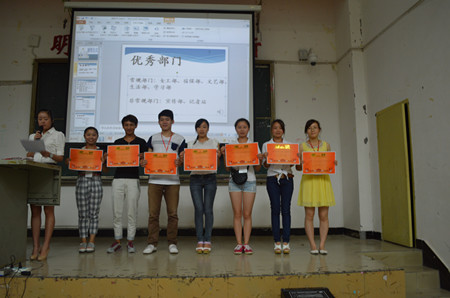 会议伊始,由瞿老师发表讲话。就各部门、班级在本学期中所取得的成绩瞿老师给予了充分肯定,并对优秀团队和个人进行深层次的分析,望大家把学习与工作并重,扬长避短,继续努力。接着,由常规部门以及非常规部门代表,对我系学生会本期总结以及下期工作计划进行了简要讲述。紧接着,助理办代表及下一届学生代表进行发言。最后,瞿老师为优秀部门、干事以及优秀班级、寝室颁发了奖状,以示鼓励。在瞿老师的总结中,大会圆满结束。