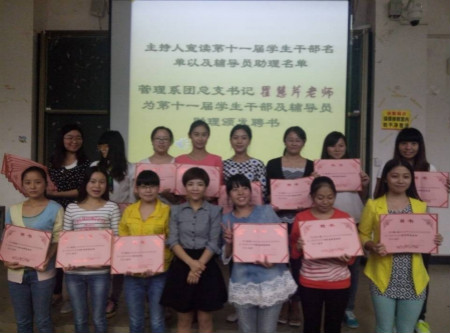 会议伊始,曾丽雯对上一年的工作作了回顾与总结,她在肯定学生会工作、成绩的同时,希望新一届的负责人能够“在其位,谋其政,尽其责”,齐心协力,将管理系建设得越来越好。随后,瞿老师宣布了第12届学生会负责人名单,同时为11届的学生会干部颁发了聘书,并对他们过去一年的工作给予了肯定。最后,在瞿老师老师的总结中,会议圆满落幕。