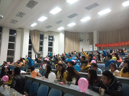 2014年11月20日晚7点30分,由院团委主办,我系学生分会学习部承办的学风校风知识竞赛在D201成功举办,出席此次比赛的评委有:我学院院组织部部长周忠杰、王艺,我系团总支副书记张钰文,学生分会主席刘自强、副主席张晓璐,13级各部门部长以及13级部分学生。