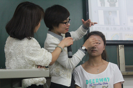 活动伊始,瞿老师对仪表礼仪进行了讲解,旨在进一步提高同学们的形象素质,为同学们以后进入职场打下基石;紧接着,她针对彩妆技巧进行一一解说,并且对模特进行了现场化妆,以便同学们更好的理解讲授内容;最后,瞿老师针对不同季节,不同地方使用香水的方式方法进行了简单讲解。在瞿老师生动的讲授中,活动落下了帷幕。