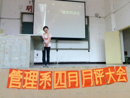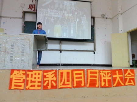 2014年5月18日晚7点30分,我系在D101举行了四月月评大会,参加此次会议的有:管理系团总支书记瞿慧芹老师、团总支副书记徐盼、学生分会主席曾丽雯、两会干部以及各寝室代表。