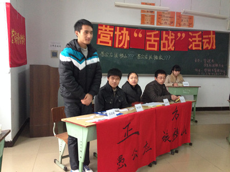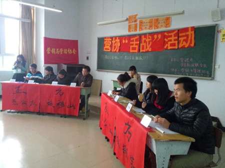 2013年12月21日下午两点半,由管理系学生社团联合会主办、营销与管理协会承办的辩论赛在四教514成功举行。管理系团总支书记瞿慧芹,团总支副书记徐盼、学生分会主席曾丽雯、演讲与辩论协会代表作为评委出席了本次比赛,管理系两会干部作为嘉宾观看了本次比赛。