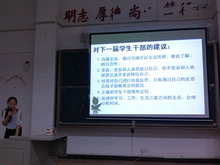 大会共分为三个环节。首先是李娣和康瑞鑫分别就本学期团总支和学生会的工作作总结。她们既肯定了这一届团总支和学生会所取得的成绩,又客观地指出了自己工作中存在的不足;同时希望下一届的学生会干部能够“长江后浪推前浪”,把管理系的学生工作推上一个新的台阶。紧接着是颁奖环节,虞老师以及其他几位辅导员分别为获奖班级、优秀寝室、优秀干事、优秀部门、部长、辅导员助理颁发奖状以及聘书。最后由伍书记为本次大会做总结。他首先宣布了11届学生会的干部名单,然后对上一届的学生干部们表示感谢并对下一届的学生干部们提出希望,最后对所有的师生表达了自己的祝愿!
