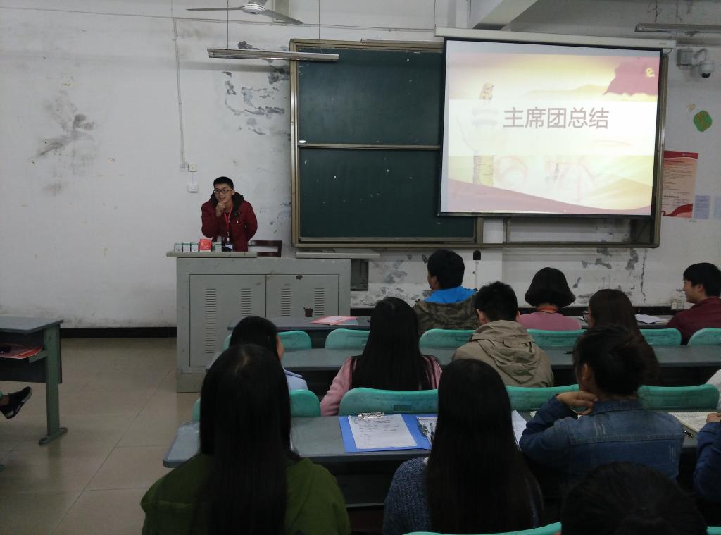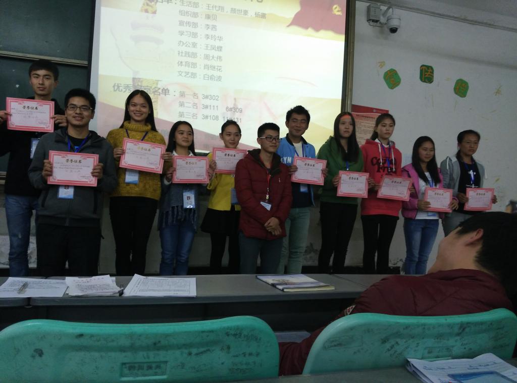 在杨婷和邓茜两位主持人的介绍中大会正式开始。大会第一项:各部门部长就10月工作做出总结,其中包括各部门新干事人数的确定、部门内部举办的活动情况,并就下月部门工作计划做出了详细的说明;大会第二项:由副书记黄明兴对月评大会作总结发言,他首先对各部门新干事的加入表示热烈欢迎并寄予希望,随后对10月开展的素质拓展活动做出总结,并表示希望多多开展各类增进部门间团结的拓展;大会第三项:由15级各班班长总结发言,各班长在发言中都针对班级卫生、作风、学习态度方面做出总结,也希望今后再接再厉,力争上游;大会最后:由主席团为10月优秀干事、优秀寝室、优秀班级颁发奖状及奖品,并合影留恋。