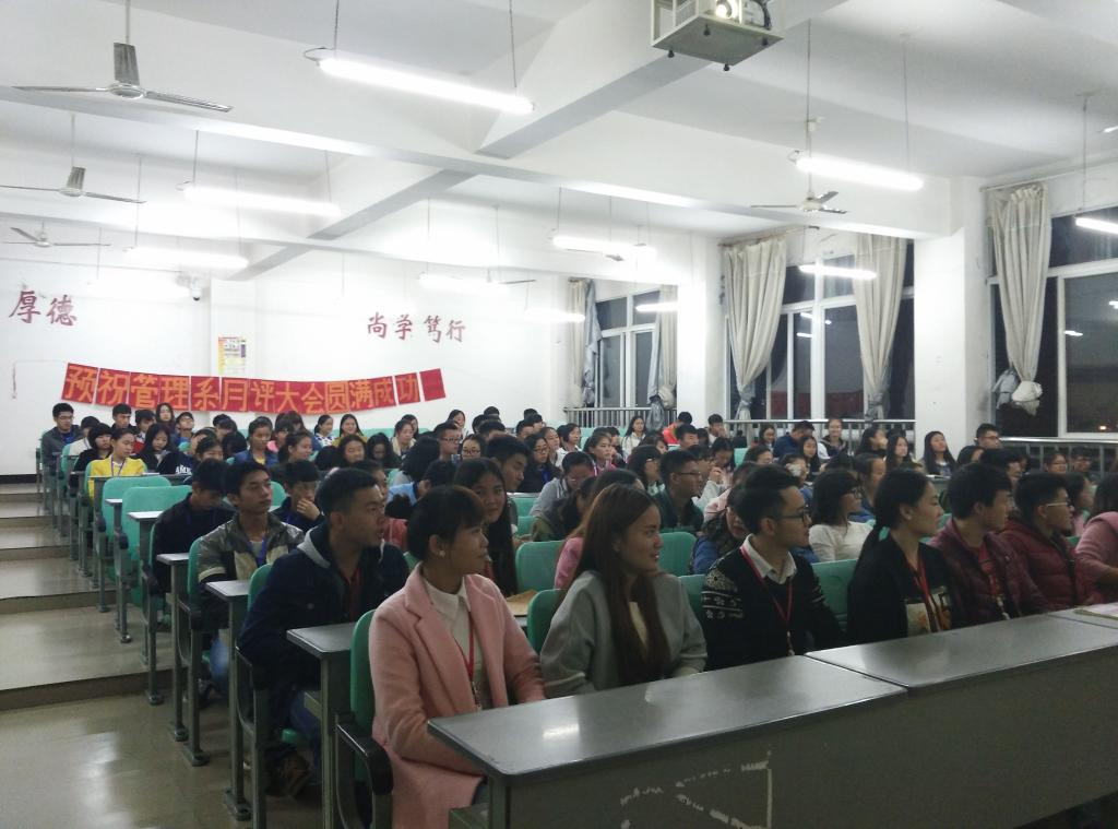 2015年11月4日19点整,我系10月月评大会在A501成功举行。团总支副书记黄明兴、学生分会主席张智林、副主席张节美、两会干部、15级各班班长和团支书、及优秀寝室代表,参加了本次月评大会。