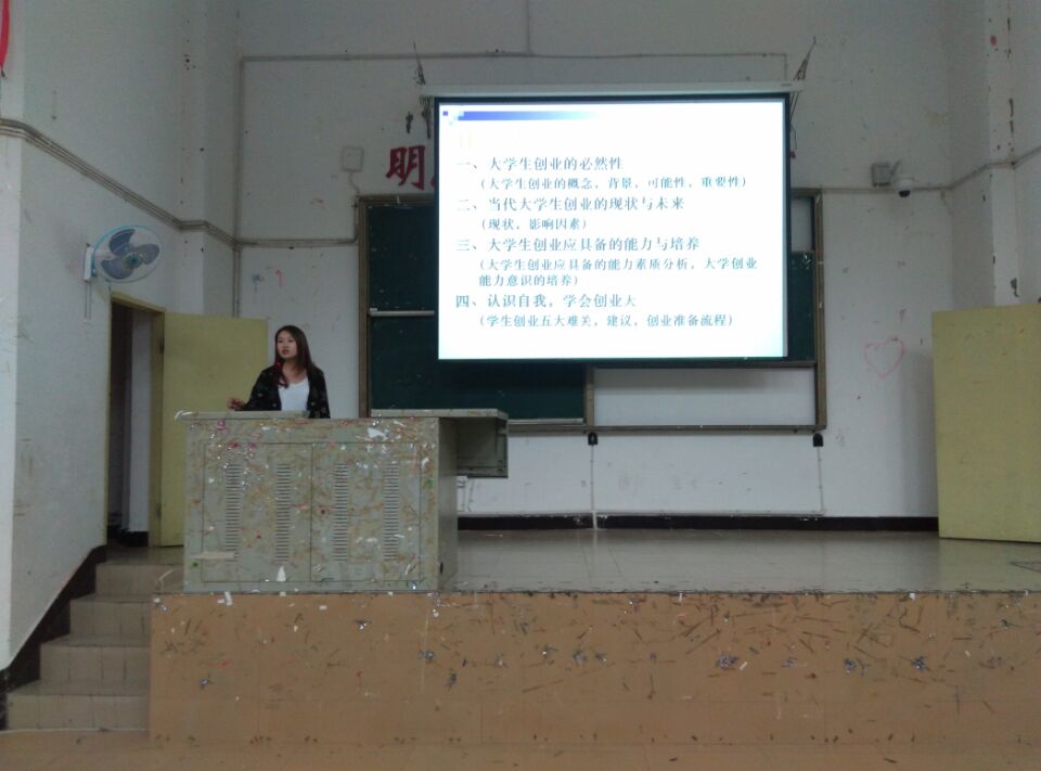 陈橙老师用生动的语言、鲜明的事例,主要围绕四点内容进行培训。一:大学生创业的必然性;二:现状与未来;三:创业应具备的能力与素养;四:认识自我,学会创业。她对大学生事业成功的基本点等问题进行了深入讲解,并切合实际提出了一些要求,强调同学们在踏上工作岗位之后,需要怀有一种虚心的学习态度,对待工作要塌实肯干、执着追求。陈橙老师联系自身经历从另一个角度讲述了在校大学生如何看待今天的就业形势、学会正确分析自己的长处与短处、面对目前的就业形势如何转变就业观念等多个方面的问题,为同学们做了一场精彩的讲座。