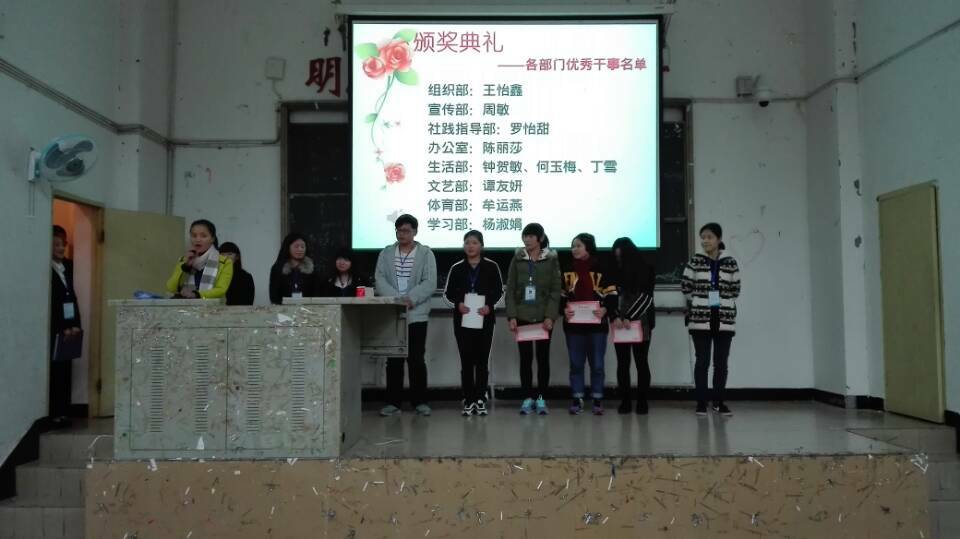 在吴雪、曾健林两位主持人的介绍中大会正式开始。大会第一项:各部门部长就11月工作做出总结,其中包括各部门十一月展开的活动、部门内部所展开的活动情况等,并就下月工作的开展做了详细的计划及说明;大会第二项:由主席团代表张节美对月评大会做总结发言,她对各部门间所存在的问题提出批评,并希望各部门在接下来的工作中再接再厉;大会第三项:由电商、物流协会会长发言;大会最后,由主席团为十一月优秀干事、优秀寝室、优秀班级、优秀协会干事颁发奖状及奖品,并合影留恋。