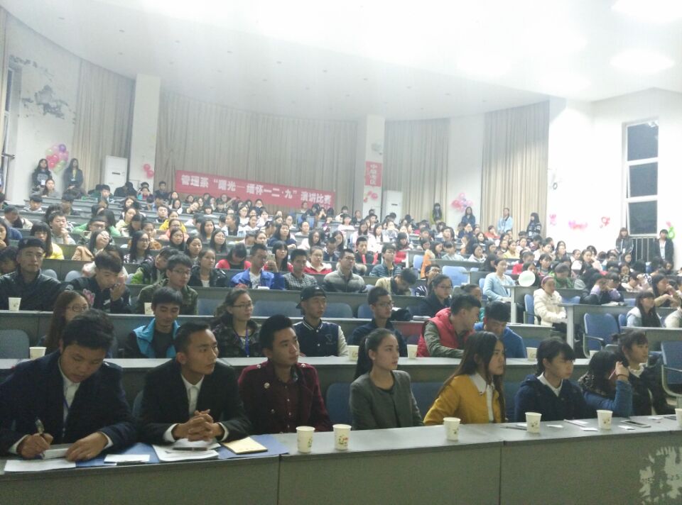2015年11月20日19点整,我系“曙光—缅怀,一二·九”朗诵、演讲比赛在D201成功举行。本次比赛由团总支副书记黄明兴、学生分会主席张智林、副主席张节美、两会干部担任评委。管理系15级全体学生观看了本次比赛。