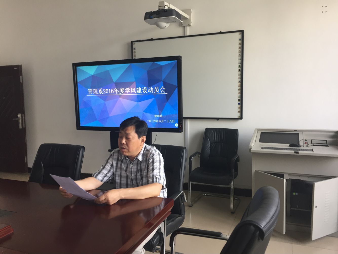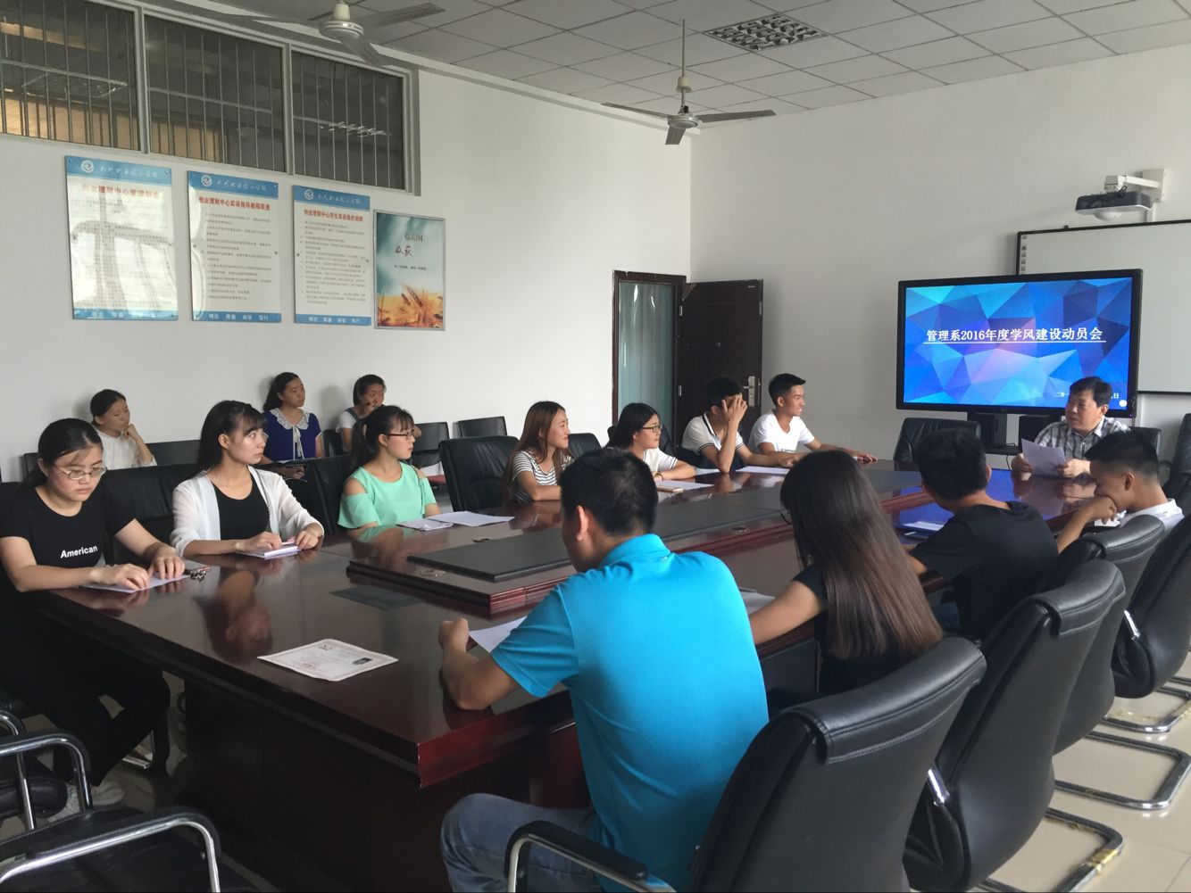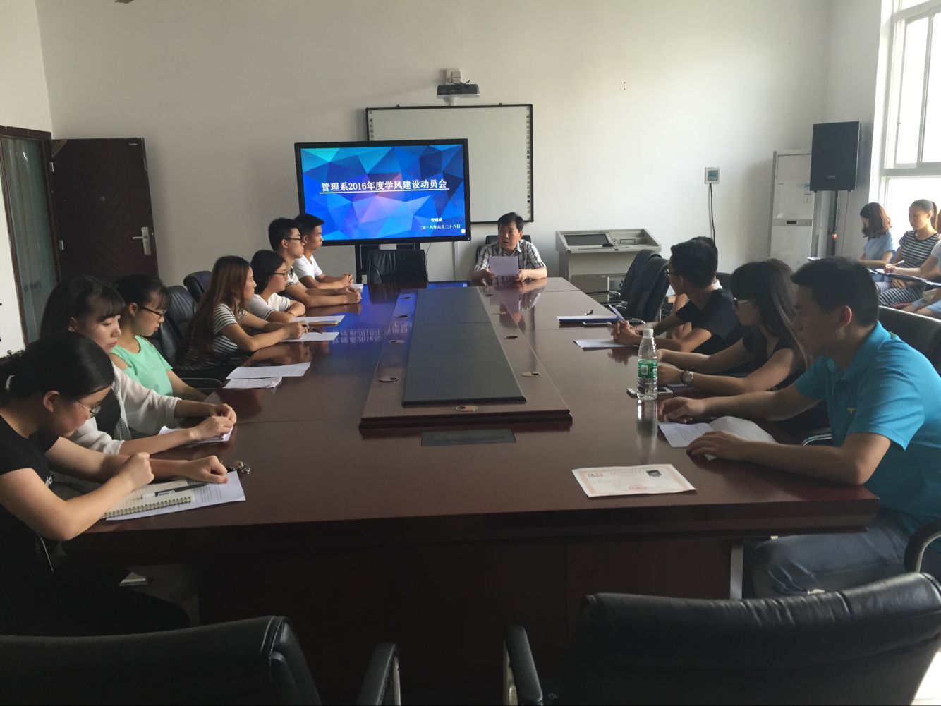 2016年6月28日下午5点,我系在四教四楼商务洽谈室召开了“2016年度学风建设动员会。”参加本次动员会的有姚主任以及14、15级各班班长、学习委员。