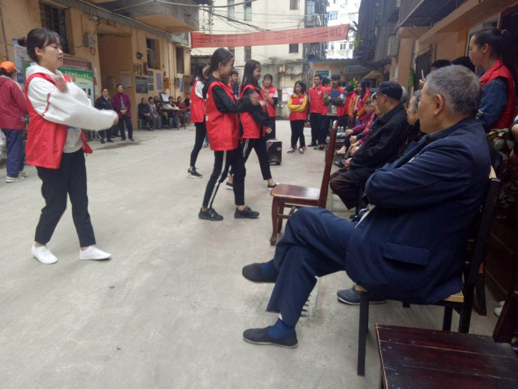 志愿者们带着为老人准备的节目并满怀热情的来到社区。在志愿者肖靖高带来的《当你老了》歌曲之后,活动正式开展。志愿者们相继表演了小品、舞蹈、朗诵等节目,每一个热情洋溢的节目都让老人们满意的竖起大拇指。活动过程中志愿者们陪同老人说话,为老人捶腿揉肩,现场温馨和睦,最后由全体志愿者带来歌曲《常回家看看》,送给所有老人。至此,社区活动圆满结束