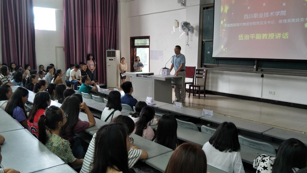 本活动在瞿慧芹老师的主持下有序进行,在播放物流学院宣传片后,首先由系主任姚进昆副教授致欢迎辞。接下来教师代表陈俊杰老师向全系新生表示欢迎并提出学习建议等。紧接着接着16级学生代表周榆林分享了他大学一年的学习心得和生活经验。随后17级新生代表魏艳讲述了她初入大学的一些体会以及对大学的憧憬。最后由我系党总支书记伍治平副教授提出对全体新生的殷切希望,并祝福同学们拥有美好的大学时光。至此,开学典礼圆满结束。