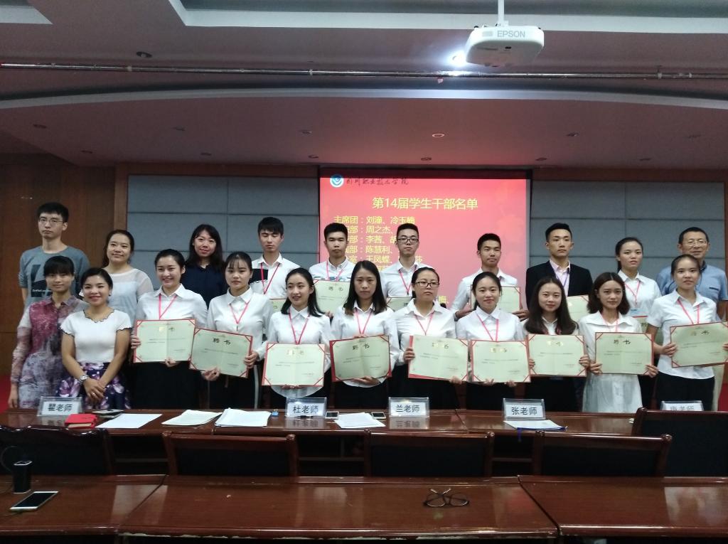 首先,伍书记为大会致辞,对第十五届学生干部提出四点期望,并祝愿他们学习、工作、生活中越来越好。紧接着,十四届学生分会主席刘潼发言,畅谈感想,并表达了了对新人的希望。随后,十五届干部代表邹静发言,提出对未来工作的展望,做到精诚团结,与时俱进。最后,团总支书记瞿老师宣读第十四届学生干部及干事名单,颁发聘书并合影留恋。当老干部将新的工作牌戴在新干部的脖子上时,换届大会取得圆满成功。