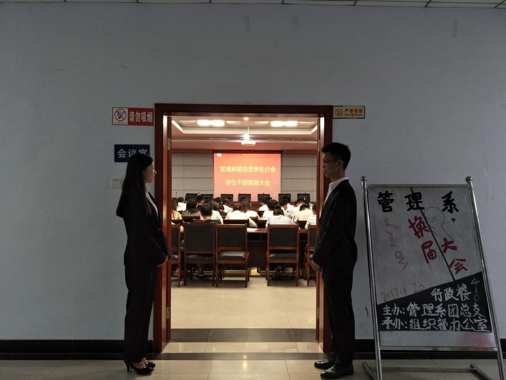 2017年9月26日晚上7点40分,管理系团总支学生分会第十五届学生干部换届大会在行政楼410顺利召开。出席的嘉宾有:党总支书记伍治平副教授、团总支书记瞿慧芹老师、辅导员兰涵、杜丽老师、班主任唐寻、张燕老师。我系第十四届学生干部及干事参加了此次大会。
