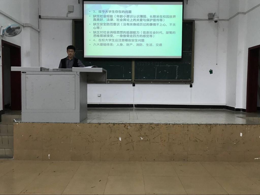 为增强2017级学生的安全意识,提高自我保护能力,创建平安校园。我系安全教育讲座于2017年10月23日晚七点在D101成功举行。由辅导员贾杨兵老师担任本次讲座主讲人,17级全体学生参加了本次讲座。