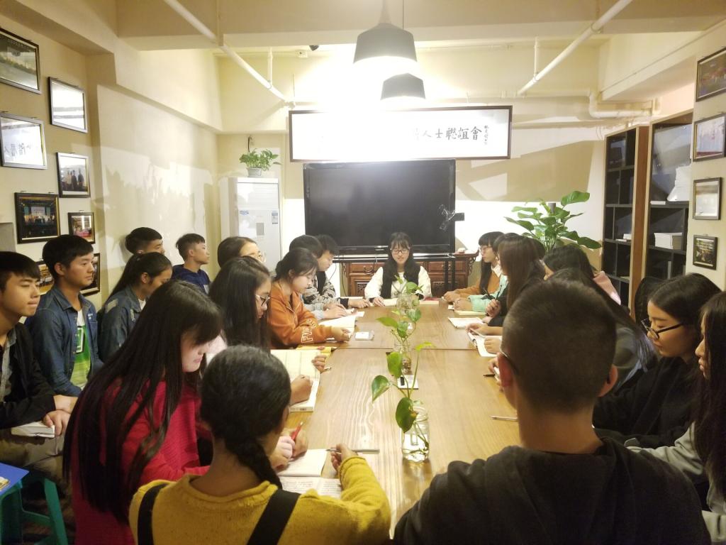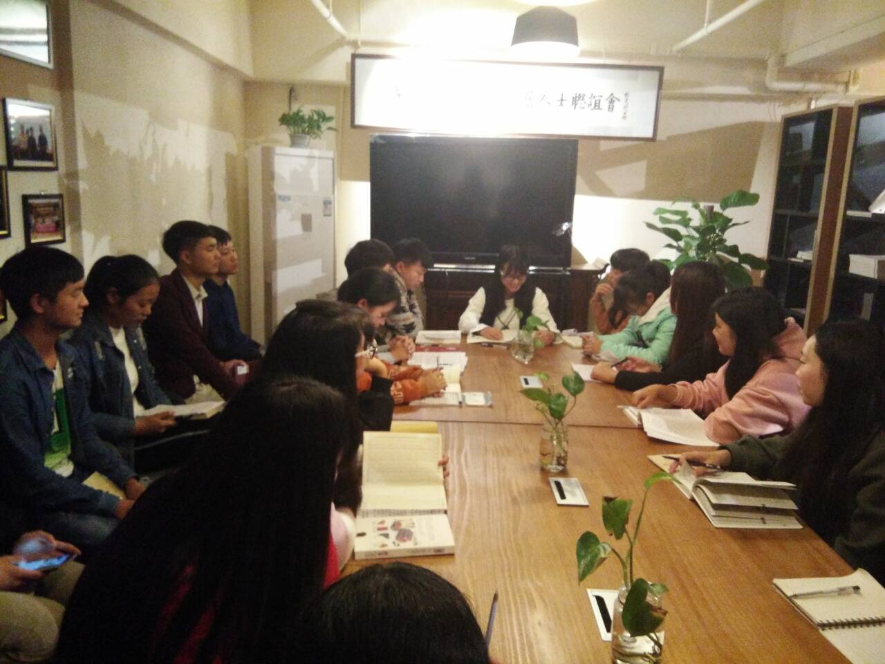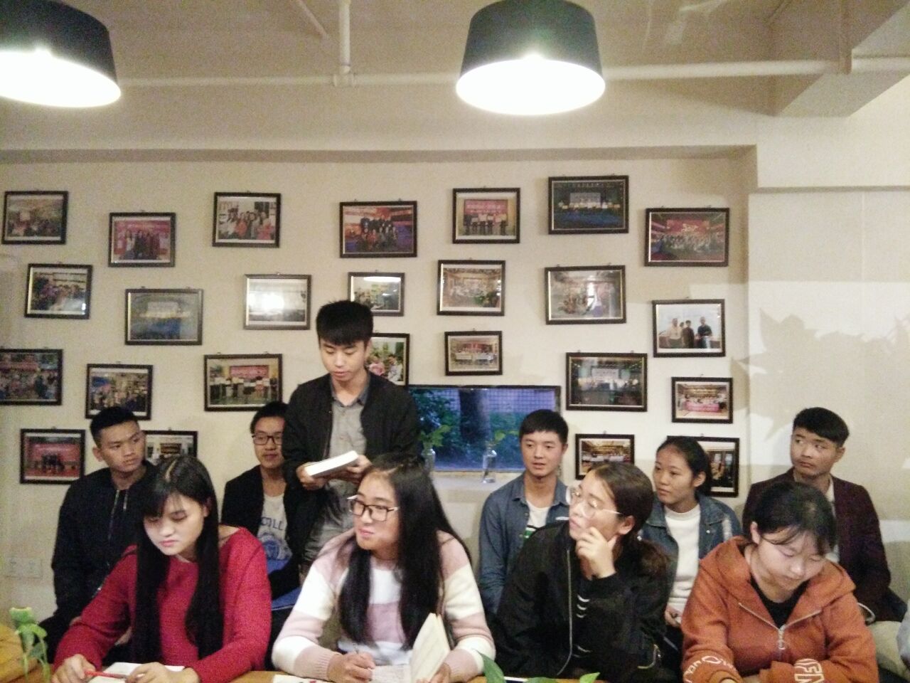 2017年11月2日晚7点30分。我系在席殊书屋开办了此次读书分享交流会,并直播同学们交流的过程,主题为“跟党走”。学习部负责人刘文静和刘博文带领二十五名17级学生参加了本次活动。