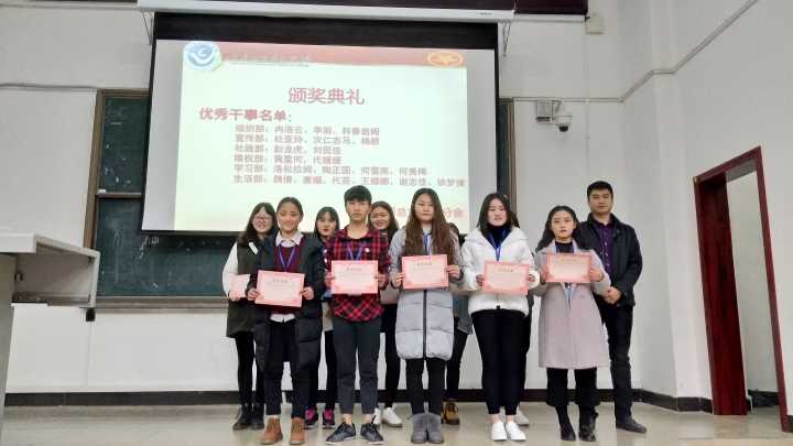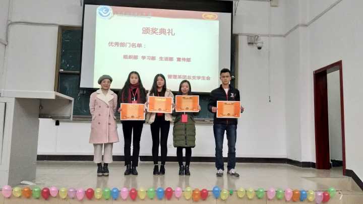大会开始,团总支学生分会各部门及优秀班级代表进行学期工作总结,分享经验。总结结束后,由团总支书记瞿慧芹老师宣读表彰名单并讲话,瞿老师强调总结就是要让大家看到你们真正的工作成果,下学期对不足之处又将采取什么措施改进。并指出了班级总结的可取之处,希望大家向他们学习。相信瞿老师的讲话会带给大家不一样的收获。最后,由各位老师为优秀部门、优秀干事、优秀班级、优秀寝室颁奖,并分别合影留念。截止晚上21点10分大会圆满结束。