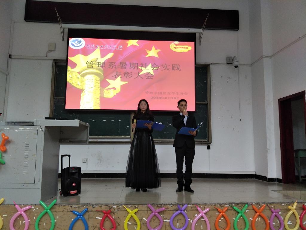 首先,由主持人宣读本次暑期社会实践先进个人及优秀团支部,由管理系团总支学生分会副书记李丽为获得优秀团支部的班级颁发荣誉证书。营销班班长毫不保留的向我们分享他们的实践经验。紧接着,学生会副主席赵倩和社践部部长杨林川为先进个人颁发证书并合影留念。随后,6个优秀代表上台与大家分享在社会实践过程中的个人感受及总结出的实践经验方法。最后,团总支副书记李丽进行大会总结,她说社会实践是丰富大学生活一个重要途径,希望同学们在社会实践中,理论联系实际,将在校园学习到的理论知识运用到生活中,提高社会实践能力,并呼吁同学们积极参与社会实践。此次大会取得圆满成功。