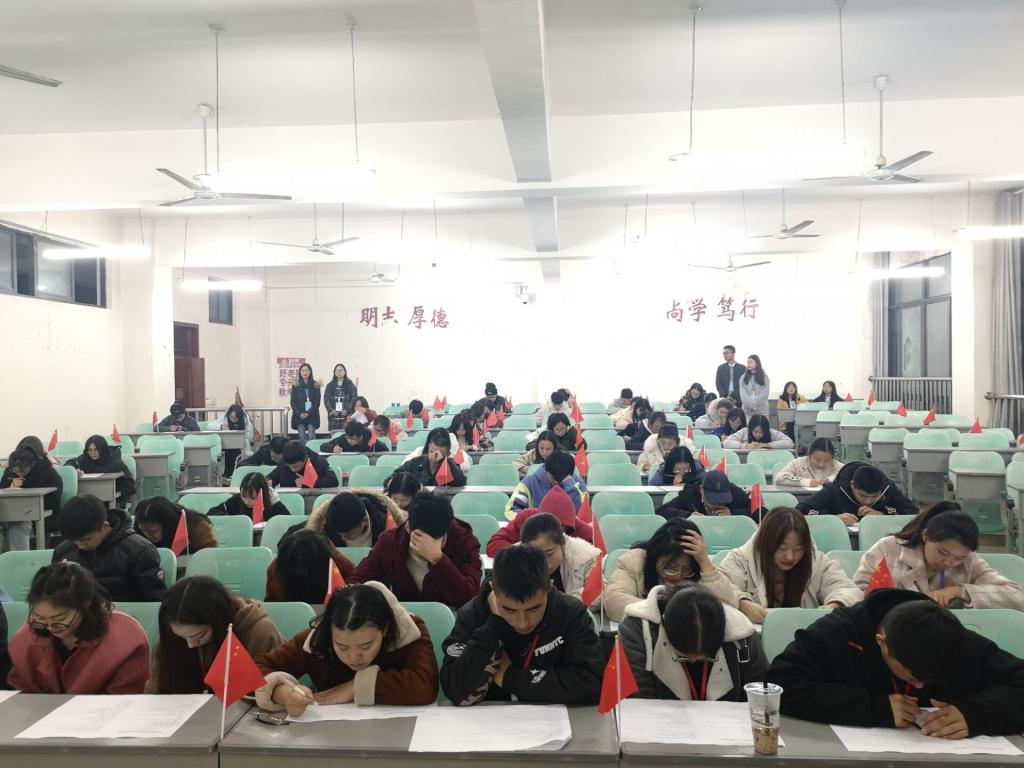 首先,由主持人宣读比赛环节及规则,比赛分为两个环节,第一环节为笔试环节,参赛选手有40分钟的时间完成答卷,大家在题场上都很认真的做题。第二环节为抢答环节,抢答环节中参赛者皆踊跃参与其中,比赛到达高潮环节,竞争十分激烈。由文艺部干事梁莎莎,刘恩玲带来中场节目:歌曲《我的未来不是梦》,在此期间,我们也一同观看了《四川职业技术学院的发展历程》,令我们为之感叹。经过激烈的角逐,李海燕同学荣获一等奖,徐佳妍雪芹同学荣获二等奖;张宇,赵倩利同学荣获三等奖;还有六名同学取得名次。主席,副主席,副书记分别为他们颁奖并合影留念,本次竞赛活动圆满成功。