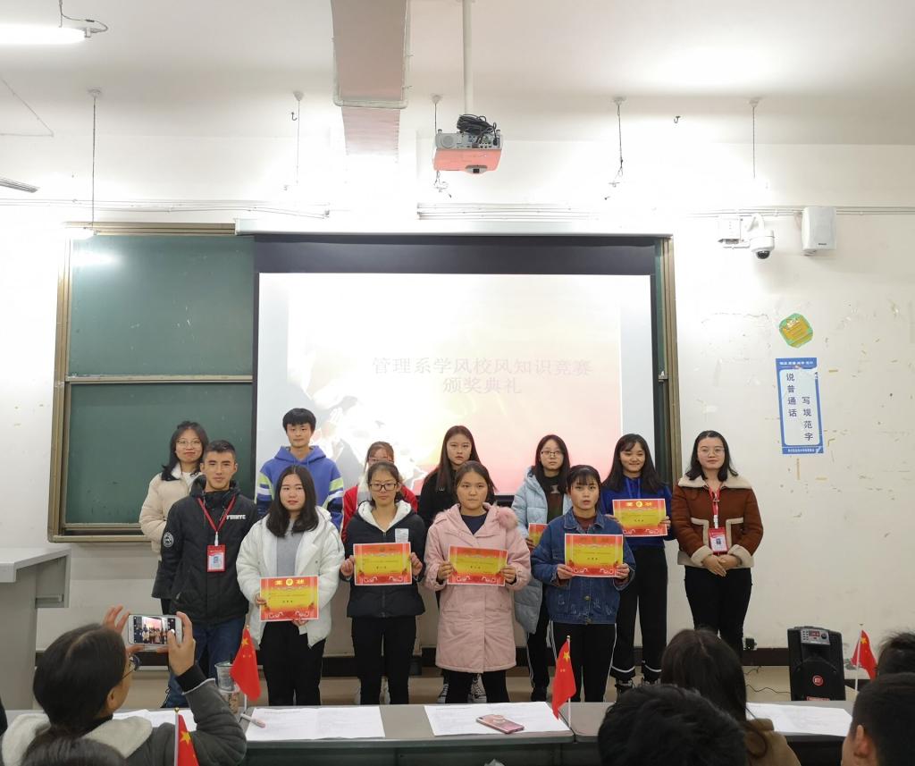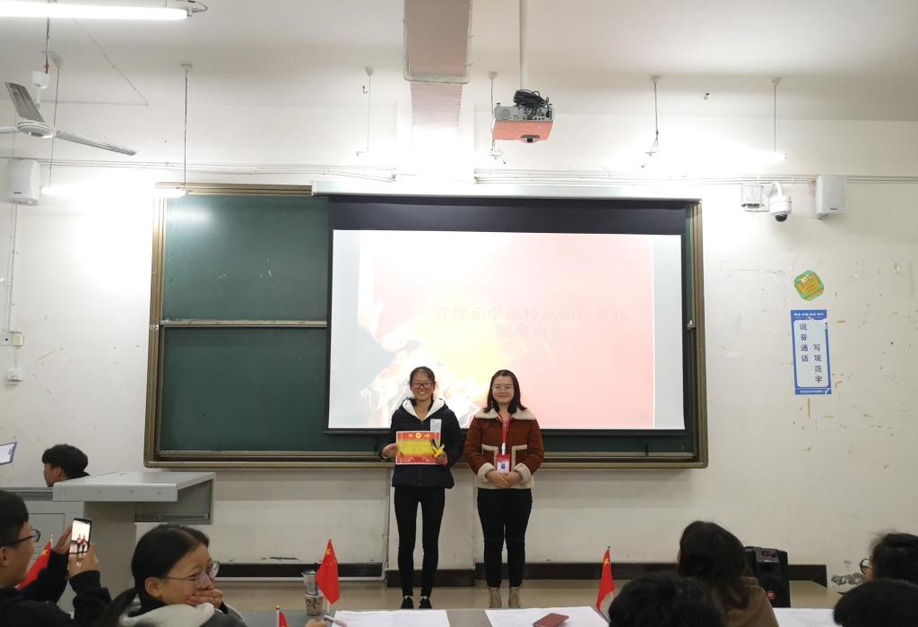 2018年11月25日晚19点30分,由我系学生分会学习部承办的“学风校风知识竞赛”,在 A503成功举办。学生会主席杨向东,副书记李丽,副主席赵倩,各部门负责人及部分同学到场观看,由各班推选出来的参赛选手到场参加比赛。