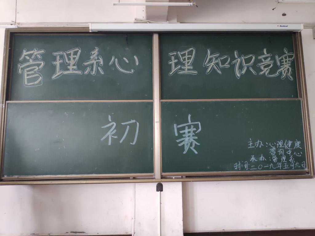 2019年5月9日下午15点整,由管理系承办的“心里健康知识竞赛初赛”在A503成功举办。到场本次活动的有:学生会主席杨向东,以及学生分会学习部,及来自各班的参赛选手。