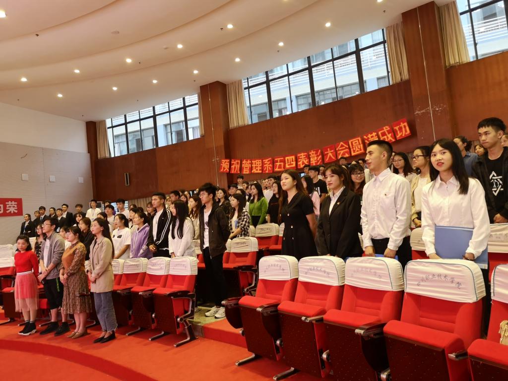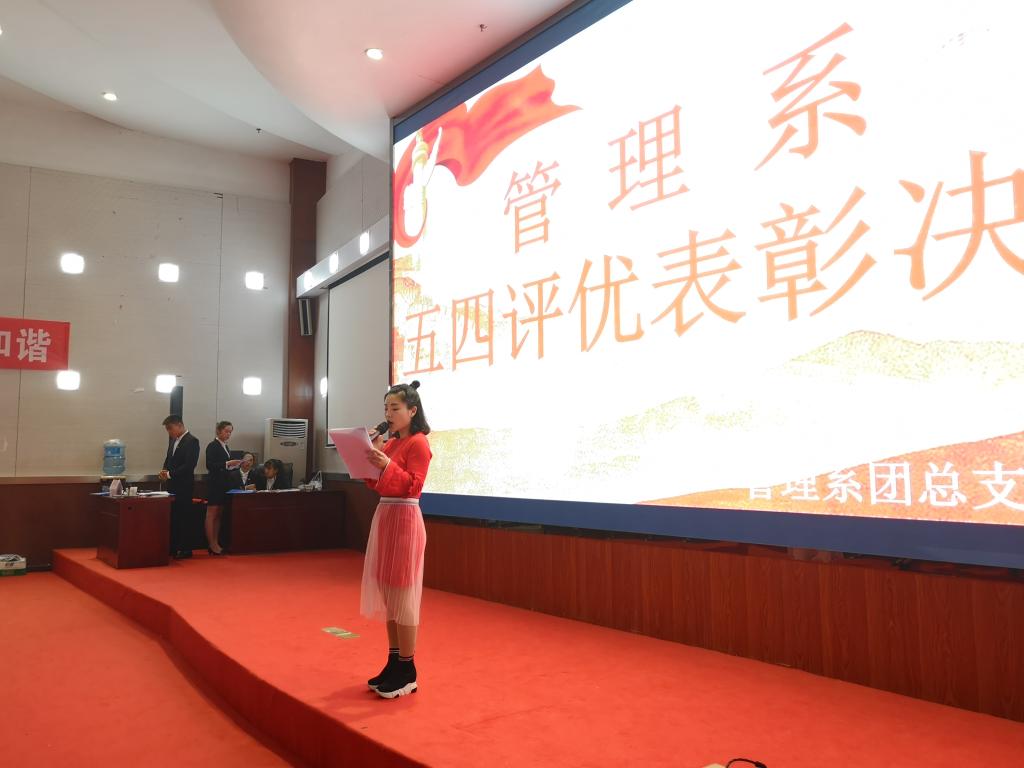 首先,全体起立奏唱团歌。紧接着,由管理系团总支书记瞿慧芹讲话,她宣读了《表彰决议》并传达了其精神,同时对全体获奖同学与班级表示了祝贺,她提出获奖同学应该不断提升自身修养与素质,在日常学习和生活中起到表率与标杆作用。最后,嘉宾老师为获奖同学们颁奖并合影留念,获奖学生代表上台发表了精彩讲话。至此,本次表彰大会圆满结束。